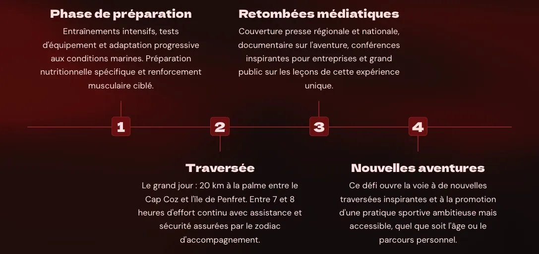 Cette traversée des Glénan à la palme n'est pas seulement un exploit sportif personnel, mais le début d'une aventure plus large visant à inspirer et motiver chacun à repousser ses propres limites. Les partenaires de ce projet inaugural seront associés à cette philosophie positive et dynamique.